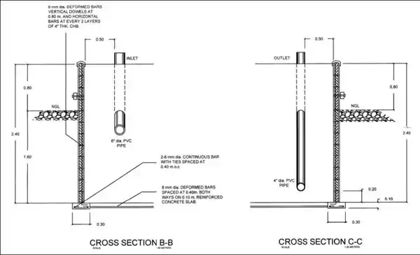 5. Build the reinforced CHB walls. Upon reaching ground level, layout CHB walls for outlet compartment so that CHB and rebar interlocks are maintained. (Do not install all CHB for outlet compartment. See instructions below regarding cover installation.)
