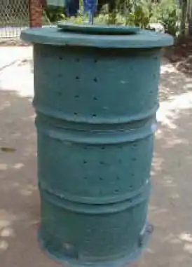 Bin composting is the most popular and advance version of home composting system that overcomes problems experienced in other composting systems. There are different types of bins available for home composting and generally it varies from 200- 300L in size. These are from different materials such as cement/concrete, plastic, metal, etc. The bins allow higher stacking of composting materials and better use of floor space than free-standing piles. Bins can also eliminate weather problems and reduce problems of odours, and provide better temperature control. At present, most bins are designed to suit the urban landscape as well.