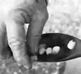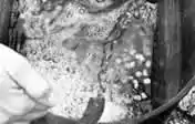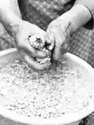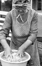First shell the corn by rubbing the cobs together so that the kernels come off. Then wash the corn to remove parts of the cob and silks. Next put it into an iron kettle or other suitable container with enough lye water to cover it. They used two tablespoons of concentrated lye to a quart of corn. The lye is used to loosen the husk and the black tip or heart on the corn. Repeated cooking makes the hard corn sort enough to eat. Build a fire under the kettle and cook it until the husk is loosened, about twenty to twenty-five minutes. Then wash the corn in hot water to remove the skins and the lye. The lye will cause white corn to turn yellow, but after three or four washings and boilings, it will return to its natural color. After washing, put the corn in clean water and boil again about twenty minutes and wash again. This washing and boiling in fresh water is repeated until the corn is tender enough to be eaten and the husks and black hearts are removed.