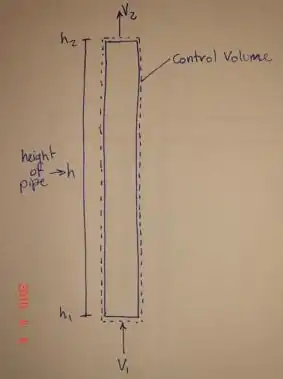 Where h2-h1 is the difference in height between the top and bottom of the hose and this is indicated in figure 3 below. P2 can be taken as zero since it is equal to the atmospheric pressure. Note a control volume was taken around the hose and this is indicated in figure 3 below.