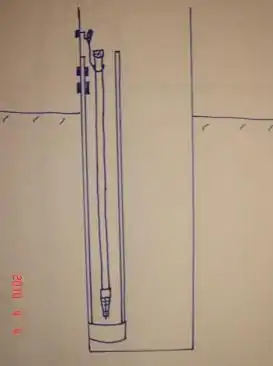 Note drill holes where arrows are located - Fasten PVC schedule 40 pipe to the side of the well casing with 1/2" carriage bolts and nuts
