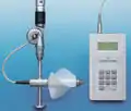 Vortex meter: velocity is proportional to the downstream frequency of the vortex flow and is read on a digital readout. It is used for measuring flow in pipes. [7]