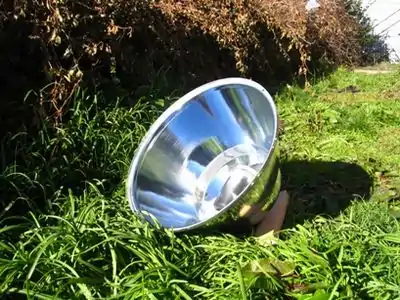 - Description: This is a parabolic solar cooker made from a decommissioned stadium light reflector. It can be used for cooking, specifically, anything that is made with boiling water. So far, it has worked best by placing a jar painted with black, non-toxic paint at the focal point in the base of the solar cooker while having the cooker pointed at the sun.
