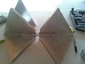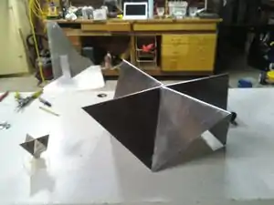 (Photo by Tate Morgan) - With the assist of a square metal tube of no larger of 3/4 of an inch wide, fold two of the diamonds in half to approximately 90 degrees and use sheet metal screws to fasten the diamonds with one folded corner to each other on to the metal tube. Create a X shape with diameter of 2 feet.