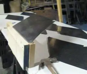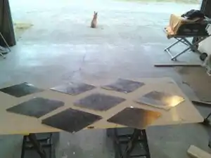 Cut aluminum pieces. (Photo by Noe Martinez) - Use available resources to bend tabs on the aluminum diamond. One way is to screw together two pieces of wood and place the tab in between them (this is our suggestion but there are other ways to bend the aluminum).