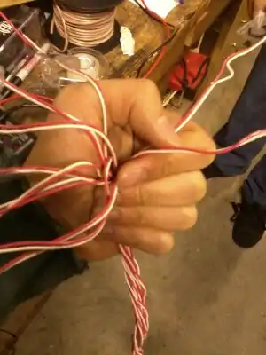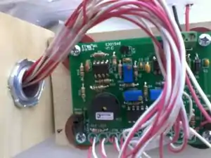 threading the wires through the conduit - Adhere plywood to Tupperware. Attach conduit to Tupperware and solder the 24 gauge wires for the LED's to the circuit board. Attach circuit board to plywood.