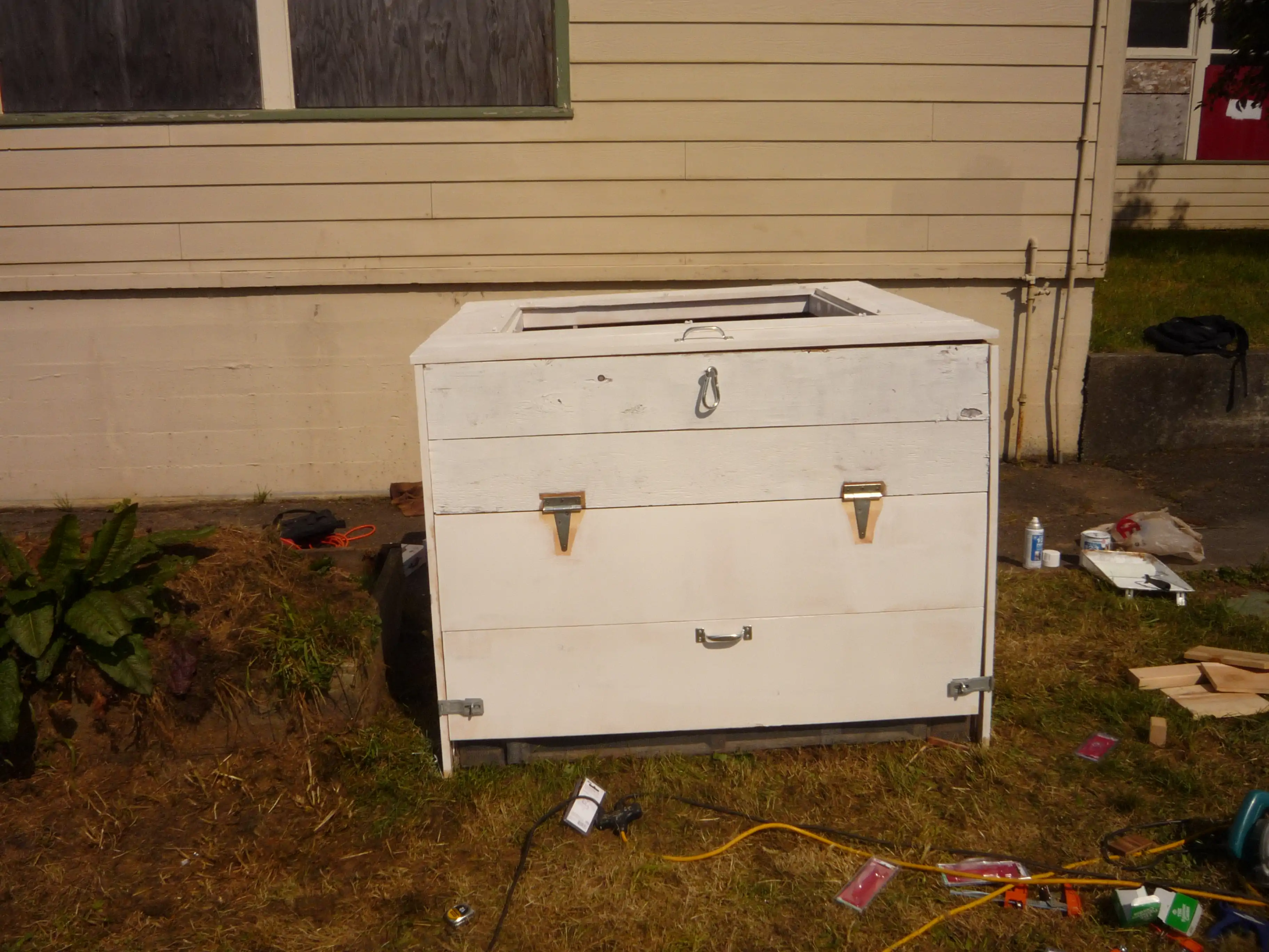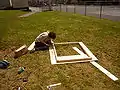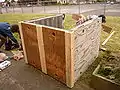 We have designed a one bin compost system with a lid in order to facilitate a hot fast composting process. The material is added to the bin and is static until the compost is ready. The first step was too wrap the pallets in a wire mesh using staples to hold in the material, keep out pests, and improve air flow. Then the pallets were placed upright and screwed together with brackets to a bottom pallet. We then sheeted out the plywood and wrapped it around the pallets. All the plywood was water treated and primed. Support blocks were put behind the plywood to hold the wood in place. We designed the bin to receive extra light and heat by having a clear Plexiglas lid. To improve the airflow of the bin we drilled four holes on each side of the bin. The front of the bin was designed to allow for the user to have enough room to shovel the compost without it being to tight. The top half of the front is plywood which supports a baffle which will hopefully keep materials away from the door making collection easier. The door was installed using hinges and includes an eye hook with a carabiner and chain to keep it up while in use. The lid was installed using hinges and can be supported up with a piece of wood. The plexiglass lid is framed in wood giving it support and durability.