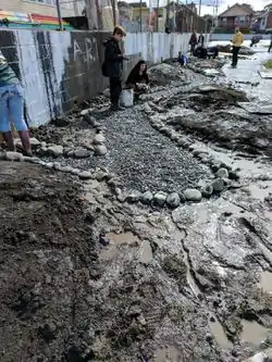 The process of creating the dry stream bed went smoothly. Digging out the stream bed was a fairly straightforward process, although there were often areas along the length of the trench that were especially compacted and/or rocky, making it hard to dig. Occasional rain along with the already high water level of the soil often made it difficult to dig as well. Because of the large volunteer turnout, this wasn't a significant problem. The next step was laying down five foot wide strips of erosion mat along the length of the stream bed, held in place with anchoring pins along. This was a fairly seamless process that followed close behind the digging phase. Once stretches of erosion mat were hammered in, volunteers used wheelbarrows to fill the trench with large gravel. Finally, the dry stream bed was lined with boulders (ranging approximately 3"-10" diameter) to cover the edges of the erosion mat and define the edge of the stream bed.