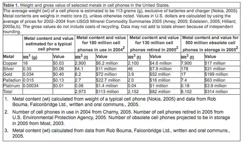 Now that we have discussed the basic components of cell phones, let’s talk about what materials are required to manufacture cell phones. Several pounds of raw materials are required to manufacture one cell phone[3], which only weighs a few ounces itself. Plastics and fiberglass are used for the housing and circuit board. Many different metals are found in cell phones (Table 1). A thin coat of gold is applied over the circuit board. Chips are soldered onto the circuit board with a metal compound. Metal is in the battery as well. It is interesting to note that in the manufacture of cell phones, there is enough mercury, lead, and arsenic in cell phones to classify them as hazardous waste[1]. Also, there is enough gold in 200 cell phones to make a gold ring[1].