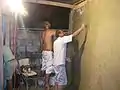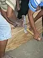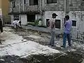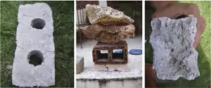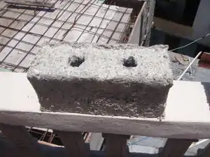 | Batch#2: For this batch, we decided to make standard-sized blocks, as all the people with building experience in the community are used to working with these kinds of blocks. For this batch, we decided to add lime, as it makes papercrete less prone to smoldering, and thus safer as a building material. The proportion of ingredients was 40%paper, 40% cement, 15% sand (fine) and 5% lime. | ![]() |