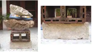 | Batch#1:For this first batch, we used the recommended proportion of paper to cement for humid climates, which is, in weight, 50% paper and 50% cement. We added sand to the mix, and that made the end formula 45% paper, 45% cement and 10% sand. The mix was made in two separate buckets, only to make it more manageable. The volume and weight of both buckets and all the ingredients were correctly measured, as is shown in the picture. The paper was soaked for a few hours, and then very well shredded into fine pieces both by hand and with a special drillbit. The mix was then poured into the forms and left to dry. | ![]() |