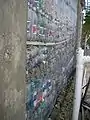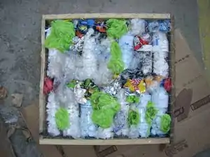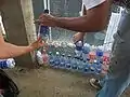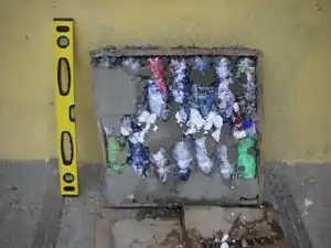 | Prototype #2: In this second edition test we shifted to a mixture of 4:1 sand to cement on one side, and 5:1 sand to cement on the other. To prevent the bottles from moving around we used found wire to tie the two surfaces of wire mesh together. We also placed trash in the holes between the bottles so that we used less cement than the fist prototype. Staples were used instead of nails to hold mesh to frame. | ![]() |