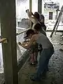Fig 8: Slowly rolling chicken wire up the wall as bottles are placed inside.