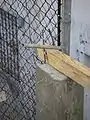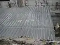 Fig 6: Holes were drilled along the pre-existing school roof and the wood framing for the roof. Rebar was pounded through the wood and into the hole in the concrete below. Finally rebar bent over to secure frame to roof.