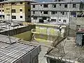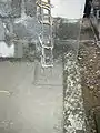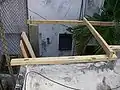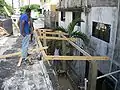 The big column: The third column would take slightly more work In order to achieve a higher level of strength we chiseled a hole in the roof (Fig 3) where the column was to be placed so that we could lower down an entire two story tall rebar column frame without having to cut it in half.