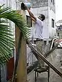 Fig 2: Using a metal pipe and arm power to bend the rebar over the wood frame, as to secure it firmly.