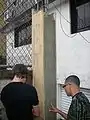 Securing the big column: After much consideration it was decided that to secure the big column we would drill 20cm into the floor of the first level, and sink the rebar in there. However, after we began drilling we found that after only 8cm there was a pocket of airspace beneath the cement floor. This would not provide enough stability to for our column. Luckily there were two back up plans. One was to build a concrete footing above the ground (0.8m x 0.8m x 0.6m with a mesh work of short rebar pieces placed into the middle). The second idea was to drill holes on both sides of the wall at every 40cm interval that corresponded with the rebar rings on the frame of the column. These holes would be drilled at different angles into the wall and a 20cm piece of rebar would be placed in them, leaving 10cm in the wall and 10cm sticking out. The piece sticking out would be wired to the column frame. In the end, we chose option number two.