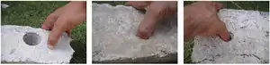 Although a very relative and not standardized method of testing, this gives a general idea of how the blocks performed under the same amount of concentrated pressure. Using medium pressure with the thumb, all bricks had a different reaction. The first, brick-sized and 4-week drying bricks had absolutely no reaction to the concentrated pressure. They felt very hard to the touch, and the stiffness is comparable to concrete. The second bricks were the ones were lime was added and 3.5 weeks drying time. There was some resistance to the concentrated force exerted on them, but with a higher amount of pressure (not so much, comparable to pushing a button rather firmly) the brick was easily penetrated. In the last image, the block tested was the standard-sized one with a little under 3 weeks drying time. There was no resistance to the finger whatsoever, and it was very easy to puncture the surface of it. The feel was soft and rather spongy. Again, this was a relative method that does not intend to throw standard results of any kind. It does, however, give a general idea of how the bricks behaved under normal handling conditions. |