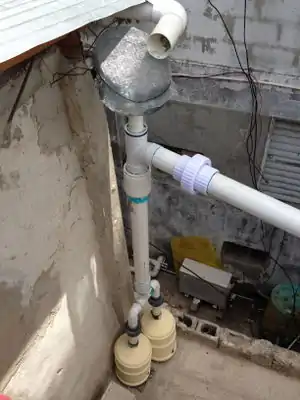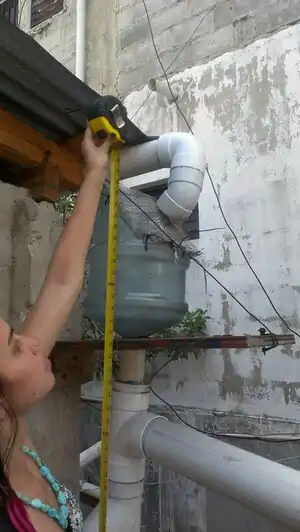 In between periods of rainfall contaminants such as debris, air pollutants, dust, animal fecal matter, and various other particles accumulate on the collection surface. During the first few minutes of rainfall, these items will be washed off of the collection surface and enter the system. Debris and pollutants entering the storage tank will significantly lower the quality of water and effect the process of making the water potable. A first flush is used to divert this contaminated water away from the storage tank. The La Yuca system reroutes the contaminated water in a length of pipe that is capped at the end. When the pipe is filled with water, a ball shuts off the top of the pipe so additional rainfall flows directly into the rainwater storage tank. There are varying opinions on the amount of volume of rainwater to divert for the first flush. Varying opinions occur because there are many variables to consider, such as the slope and smoothness of the collection surface, the intensity of the rain and how long it rains.[1]