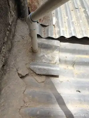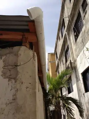 The gutter is used to transport water from the catchment surface to the first flush. The efficiency with which the gutter collects runoff water from the roof is dependent on the placement of the gutter. If the slope of the gutter is too steep, some of the runoff water will flow over the gutter. If the slope of the gutter is leveled, not all of the runoff water will flow out of the gutter into primary screening. Water left to set in the gutter will form stagnate water that will pose a risk of producing Mosquito larva and algae growth. It is a useful precaution to place an end cap on the gutter so that rodents and other small animals are unable to enter the system.