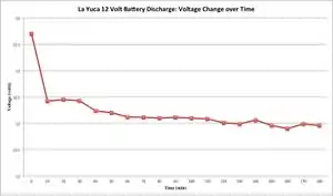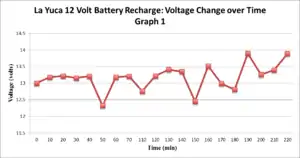 In order to evaluate the health of the batteries, the amount of hours it should take to recharge the 12V system was calculated with math and compared with the amount of time by waiting and testing the battery voltage with a multimeter. It took about three hours for the batteries to go from 60% depth of discharge to completely recharged with a voltage of 13.7. It is normal for the voltage to jump up and down as one can see in the graph. After calculations, the amount of time a healthy battery with a 60% depth of discharge was about three hours, meaning the batteries are healthy. If the batteries would recharge faster than the calculations say, then it is possible they could be damaged. Below is the equation used to determine how long the batteries should take to discharge: