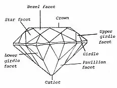 There are different types of facets such as the brilliant cut which has fifty-eight facets and others with up to 178 or more facets such as the emerald, cabochon cushion, modified brilliant, heart-shaped faceted and oval cut. In the typical brilliant cut there are several angles with different names, such as crown, upper gridle facet, girdle, pavillion facet, cutlet, lower gridle facet, star facet and the bezel facet.
