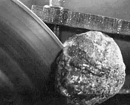 While water drops on it to keep it cool, the stones are ground away by diamond-empregnated laps which have different sizes of grits to do different things. Grits from 1,200 to 250 are used for grinding. The 250 grit lap will grind a stone down in a hurry, while a 3,000 grit lap is used to prepolish.