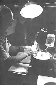 Drills are sometimes used in lapidary work to make holes in small rocks to put them on a chain or wire for a necklace or bracelet. Table drills are best for they are steadier. Rock collectors are ingenious in devising equipment. Mr. Ezard makes good use of an old dental drill with its overhead light and drills which can be altered to make a buffer or sander as well.