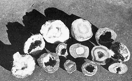 When the geode has been cut in half, the crystal formations and different layers become visible. Geodes that are solid inside are called thundereggs.