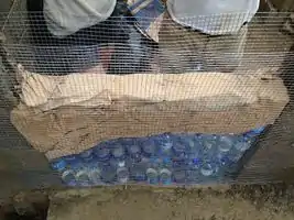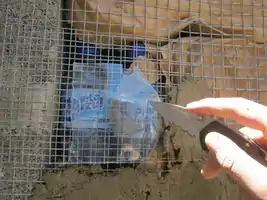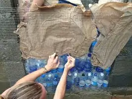 Using old cement bags to put between the plastic bottles and chicken wire so the plaster will have something to adhere to