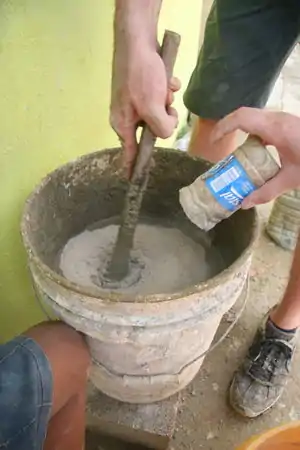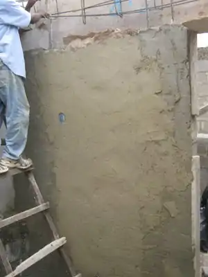 The plaster used was a traditional mix of sand, cement, and water. The first plaster layer used a ratio of approximately 18 shovels-full of sand and 1/3 of a bag of cement. Water was added slowly and mixed thoroughly until the consistency was thin enough to pass though the chicken-wire, but thick enough to hold its form inside the wall in the space between the bottles. The second layer of plaster needed to be just thin enough not to slide off the wall when applied. Each layer thereafter used a slightly lower ratio of sand per batch.