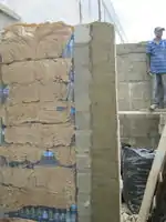 | July 4th | The two supporting columns are dry and stable, thus we can start hammering chicken wire into the bricks. By the end of today we completed one section of ecoladrillo. In all of our prototypes, we had practiced with horizontal bottles (caps and bottoms each touching the chicken wire). We ran into a bit of a snag when we realized the floor on the storage side of the Botica Popular would not be installed for some time. As we only had support from the cistern cap (doubling as the floor in the selling room), we decided to have the bottles vertical so there was not any excess hanging over an area where there is not yet flooring. We also ended up nailing the chicken wire into the mortar in between the fibercrete bricks instead of the bricks themselves. The mortar has more cement in it and would provide more strength and durability for attaching the chicken wire. | ![]() |