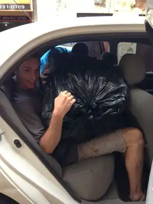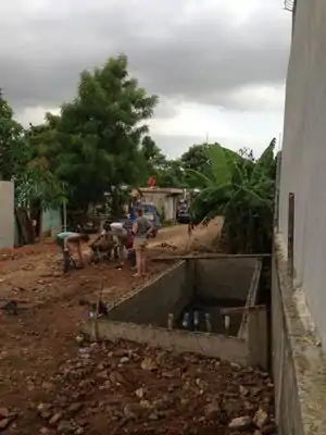 | July 2nd | The cap on the cistern is set and dry. The ecoladrillo wall is the dividing internal wall between the selling and storage rooms. The selling room is standing on top of the cistern and the storage room farther North of the cistern standing on the foundation that was made. The ecoladrillo wall's foundation is the cap to the cistern, thus today is the first day we can start constructing the ecoladrillo wall. Today we transported out (to Las Malvinas) multiple bags of bleached plastic water bottles from la Zona Colonial where they were in storage. | ![]() ![]() |