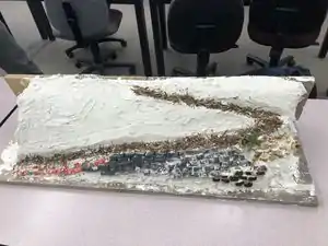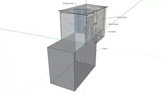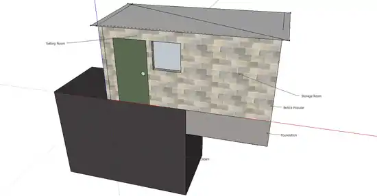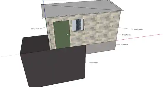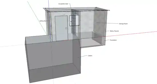 A 3D model made in Google SketchUp representing the area in which the Botica Popular was built; including the cistern which it stands on and the foundation that was created to support the storage half of the botica.