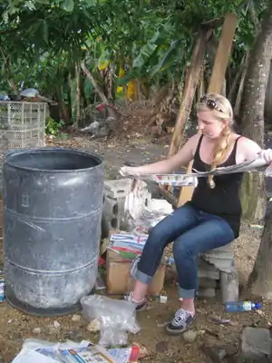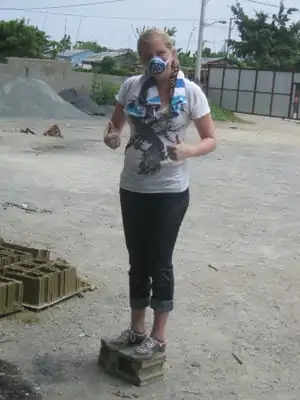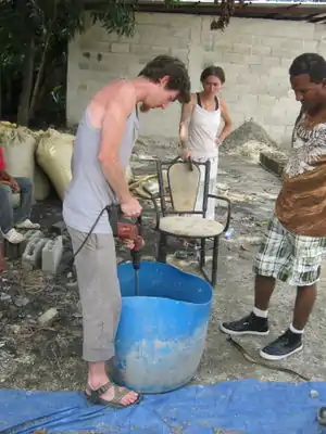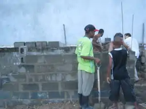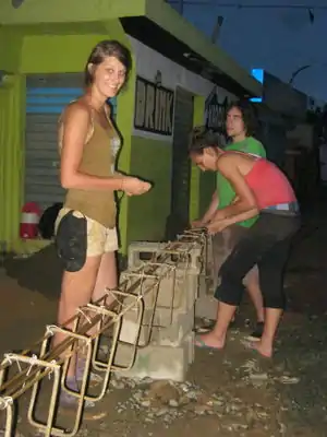 This project was part of the Summer 2013 Practivistas Dominicana project, led by Lonny Grafman in the Dominican Republic. Five students, three from Humboldt State University (HSU) in California and two from Universidad Iberoamericana (UNIBE) in Santo Domingo, collaborated with the community of Las Malvinas to construct three walls for a "Botica Popular" in the community. This experimented with cinder blocks, or concrete masonry units (CMUs) made of various upcycled materials such as sawdust, paper and rice hulls mixed with cement and pressed using an industrial cinder block maker. At the same time another team worked on building an internal wall out of ecoladrillo, or upcycled plastic bottles.