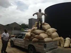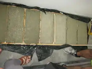 Dry the paper. It should be moist but excrete no water when squeezed so that excess water will not disrupt the ratios in the mixture and wash away cement in pressing. Ideally we tried to do this in the sun to avoid compaction of pulped paper, however due to continued rain we resorted to other means of drying the paper. We put the paper in rice hull bags and pressed it to remove excess moisture before laying it in the sun. This significantly accelerated drying time and we dry-pulped it afterwards to reduce large chunks. Dry-pulped paper did not have to be pressed and thus did not have to be re-pulped. Another method that was suggested was a centrifuge, and this would likely be effective. |