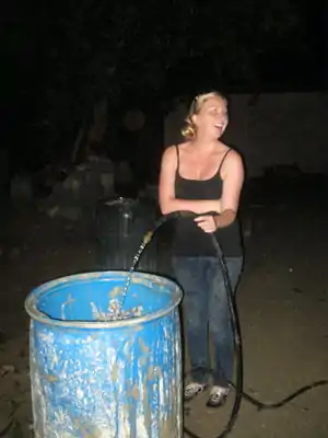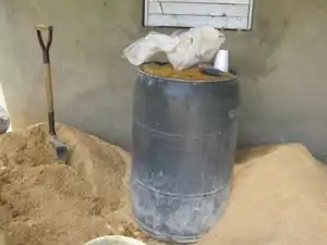 Soak paper in water and lime. Approximately 1/8 bag of lime was used in a 55 gallon barrel full of paper and water. Paper should be soaked overnight before pulping, although we also experimented with dry-pulping paper. |