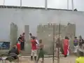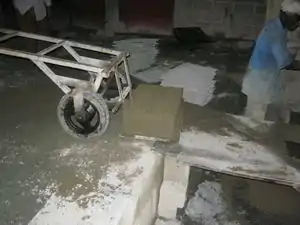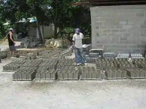 Mix and press. We had access to an industrial cement mixer and block presser for this step. The final mixture we used for papercrete was 3 wheelbarrows pulped and dried paper (assuming one wheelbarrow = 5 five-gallon buckets), 1.5 wheelbarrows sand, 2 five-gallon buckets of rice ash, 1 bag cement and 6 fluid ounces of Vinaldom SA-600, the quick-drying agent. Water was added as needed. |