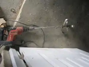 Pulp paper. We used a drill and ingenious welded attachment for pulping. Paper should be throughly wet for the pulping process for ease of pulping and to make smaller pulp. We experimented with pulping only damp paper to decrease drying time, however due to some confusion in block placement after pressing we were unable to tell how this affected the blocks. Drier paper cannot be pulped as thoroughly as wet paper, and this could account for a discrepancy we discovered in the strength of our papercrete blocks. |