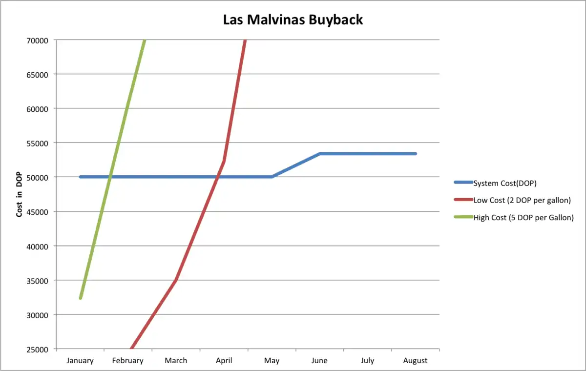 This graph illustrates the time it would take for this system to pay itself back in the form of drinkable water. This system will pay itself off in just a few months assuming that the system will catch and use 20% of all rainfall for each given month. This is because there is so much water being caught on that roof and with only four tinacos, there physically cant be enough storage to store all of that water being directed into the tinaco. The system adds 3400 DOP every year. Because this is a feasibility study, the price of the system is just a educated assumption; therefore, this system is being based on a 50,000 DOP cost. Also, because Las Malvinas is such a poor community the price for water has been adjusted to take into account certain social factors, like if the community is really paying for all of its water; therefore, the price reduction takes into account other ways of getting the same amount of water without paying. Because the roof is so large and there is a lot of rainfall in Santo Domingo, theoretically the system will pay itself off in a very short amount of time, yet it is important to note that both the cost of the system may increase if actually implemented and the amount of water used and the amount of water that remains stored in the tinaco is absolutely variable and is impossible to quantify until actually implemented.