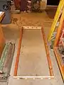 The Solar Collector, shown in Figure 3c is built using plywood and two by fours. The frame is shown in Figure 3d. The wood is fit together to create a rectangular box of 65” X 27”, with plywood acting as a base. Then the box is insulated by fitting pieces of recycled Styrofoam together on the base, shown in Figure 3f. Next the copper metal sheet, acting as a heat conductor, is placed on top of the insulation. Lastly, the corrugated polycarbonate panel, acting as a glazing, is fit on top of the box using special corrugated end pieces and side pieces, and finally screwed down.