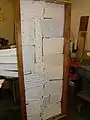 The drying cabinet, shown in Figure 3, the Sodhoppers used was actually a recycled cupboard. Any sort of box would have been a good candidate for the body of the dryer. The doors were removed and insulation was stapled to the inside of the cabinet, shown in Figure 3a. Next the shelving was put in. It consisted of 4 blocks of wood standing at each corner and smaller pieces of wood branching off of them to form a shelf that the drying racks could easily sit on, shown in Figure 3b. The Drying box with racks inside is shown in Figure 3j. Then the doors were put back on with new hinges and a latch to secure the doors, shown in Figure 3k.