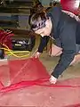 Fig 3g: Mary Wooldridge cutting nylon mesh for drying racks.