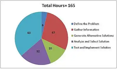 The design cost indicates the amount of hours that our group put into this design project. A total of 165 hours were spent on this design project and the majority of the design hours were spent in testing and implementing solution. Figure 7 shows a pie chart of the amount of hours spent on each design section.
