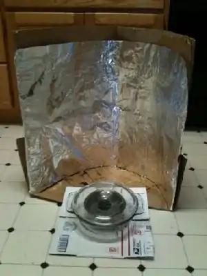 Reflector Panel A reflector panel is utilized to focus the sunlight for faster and better cooking. The reflector panel is a cardboard box propped up and bent in a parabolic shape and coated in aluminum foil, as seen in Figure 6. The cardboard box has a volume of 18”x18”x18,” but box sizes that are within a half a foot of this size in each dimension will also work. The reflector panel reflects more of the sun’s radiation toward the Solar Bowling Oven because the curved shape directs the radiation from different directions.