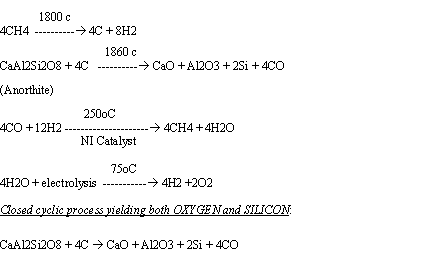 The silicon film is a proprietary process, and only a very general process is designed. (what is the reference??) The generic process consists of ceramic formation, metallurgical barrier formation, polycrystalline layer deposition, emitter diffusion and contact fabrication. The conductive ceramic substrate is fabricated from selected low-cost materials. The metallurgical barrier prevents the substrate impurities from entering and contaminating the active thin silicon layer. The randomly textured and highly reflecting metallurgical barrier improves light trapping. A suitable p- type doped 30 - 100micro-cm active layer is deposited from a liquid solution. Phosphorus and aluminum impurity gathering are used for bulk quality improvement. Cells with large areas of 240, 300 and 700 cm2 are developed. A cell with an area of 675 cm2 has demonstrated the record efficiency of 11.6 - 17.7%. The waste products present in the lunar surface are silicon, iron, TiO2, etc. These products can be used as raw materials for solar cell fabrication. A special compound called anorthite is used for extracting the above said components. Carbothermal reduction of anorthite,