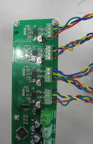 . - Working with one axis at a time, attach the motor leads to the printer controller as shown (blue, yellow, green, red from top to bottom, as shown in picture). The z-axis motors are both attached to the z-axis terminals (motors in parallel). Attach the limit switch for the current axis to the appropriate end stop terminals. There is no polarity for the end stop switches, so no need to put the wires in the terminals a certain way.