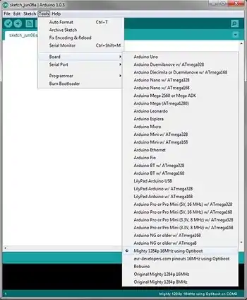 - Ensure that the proper hardware files for the Melzi controller have been installed by selecting Tools>Board and locate Mighty 1284p 16 MHz using Optiboot. If not found in the list, return to overview and follow the instructions for installing the hardware files.