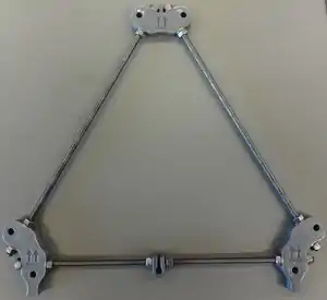 Parts for one triangle. - Put the triangle together. Make sure the clamp goes between the footed vertices and the feet are both on one edge of the triangle.