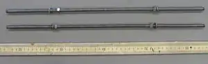 - Put a rod clamp on one 370 mm rod with a washer and a nut on both sides. Don't screw it tight; you'll need to adjust the position later. Put a nut and a washer on each side of each rod.